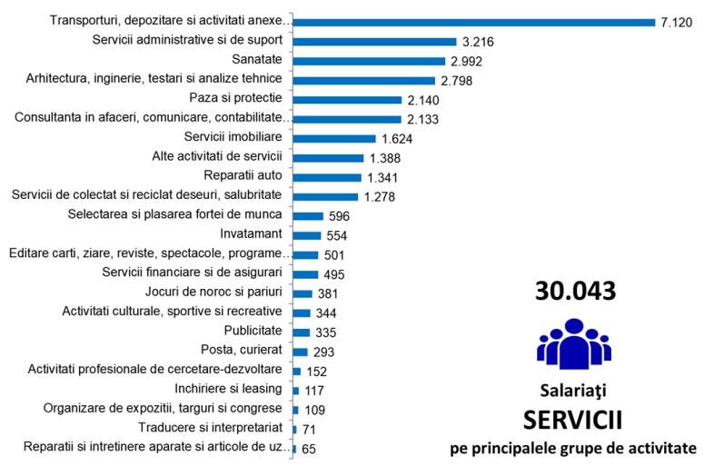 În ceea ce privește numărul de salariați din domeniul serviciilor profesionale (30.043), și acesta este în creștere în 2018, dar într-o proporție mai mică decât cifra de afaceri: cu 6% față de 2017 și cu 17% față de 2016. Principalele grupe de activități din punct de vedere al numărului de salariați sunt: Transporturi, depozitare și activități conexe; Servicii administrative și de suport; Sănătate; Arhitectură, inginerie, testări și analize tehnice.