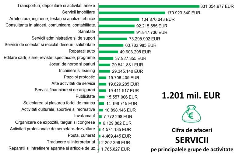 Numărul firmelor active din domeniul serviciilor la nivelul anului 2018 (6.670) constituie ponderea majoritară în ansamblul societăților comerciale (16.177), respectiv 41,23%. Aceste firme generează o cifră de afaceri cumulată de 1,20 miliarde euro, respectiv 20,63% din cifra de afaceri totală, bazându-se pe forța de muncă a 30.043 salariați (28,21%).