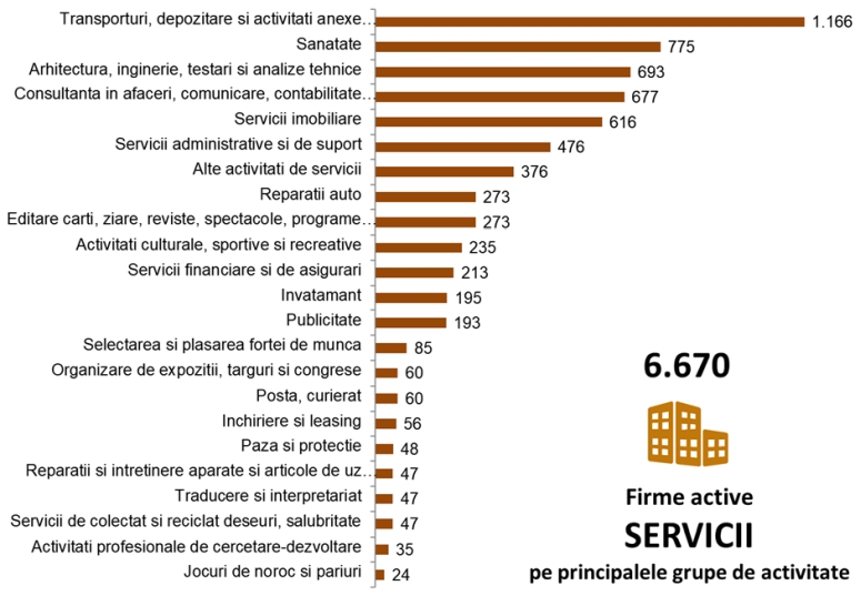 În graficul de mai jos se poate vedea, la nivelul anului 2018, distribuția numărului de firme active în acest domeniu pe principalele grupe de activități componente. De menționat că numărul total al firmelor active (6.670) a fost cu 5% mai mare decât cel din 2017 și cu 19% mai mare decât cel din 2016. După cum se observă, principalele grupe de activități din punct de vedere al numărului de firme active sunt: Transporturi, depozitare și activități conexe; Sănătate; Arhitectură, inginerie, testări și analize tehnice; Consultanță în afaceri, în comunicare, contabilitate și consultanță juridică.