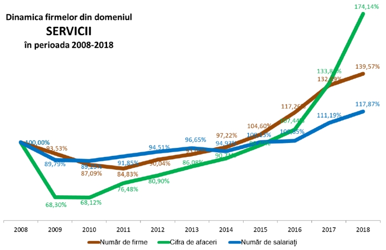 Așa cum relevă și graficul general de mai jos, tendința generală a acestui domeniu este de creștere. După reculul înregistrat în primii ani ai crizei economice, a urmat o perioadă de recuperare și apoi o creștere consolidată pe cei trei indicatori analizați, astfel că la finalul anului 2018 s-a constatat că numărul firmelor active a fost cu 39% mai mare decât cel din 2008 (anul premergător crizei economice), cifra de afaceri cumulată a firmelor din acest domeniu a fost cu 74%, iar numărul de salariați cu aproape 18%.