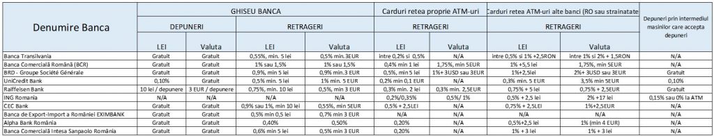 Trebuie sa știi că derularea operațiunilor cu numerar este costisitoare pentru tine. De aceea sfatul meu este să evitați pe cat posibil să retragi numerar din bancă. In tabelul de mai jos am făcut o sinteză a comisioanelor privind operațiunile cu numerar pe un eșantion de bănci comerciale care operează in Romania.