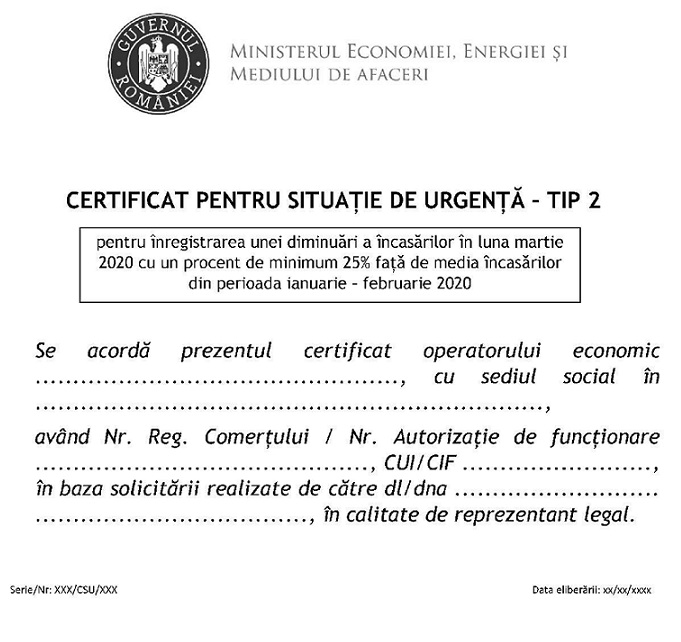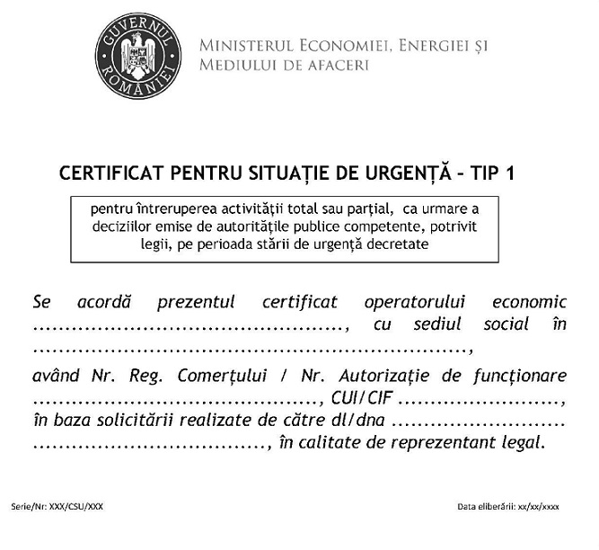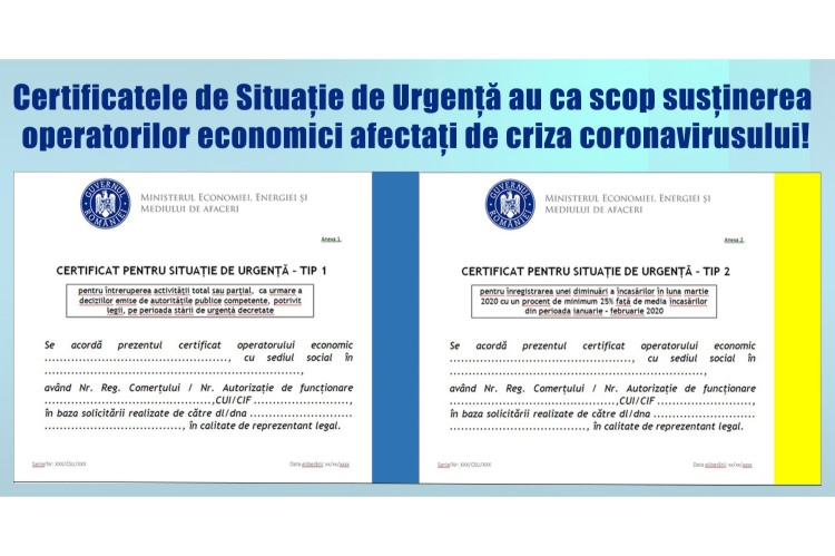Astfel, Ordinul nr. 791/2020 emis de ministrul Economiei, privind acordarea certificatelor de situații de urgență operatorilor economici a căror activitate este afectată în contextul pandemiei SARS-CoV-2, publicat în Monitorul Oficial în data de 25 martie 2020, este stabilită metodologia de solicitare și eliberare a Certificatelor de Situație de Urgență.