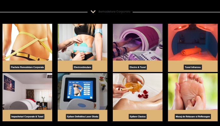 – remodelare corporală: pachete remodelare corporală, electrostimulare, electro & tunel, tunel infraroșu, împachetări corporale & tunel, epilare definitivă laser dioda, epilare clasică, masaj de relaxare și reflexogen.