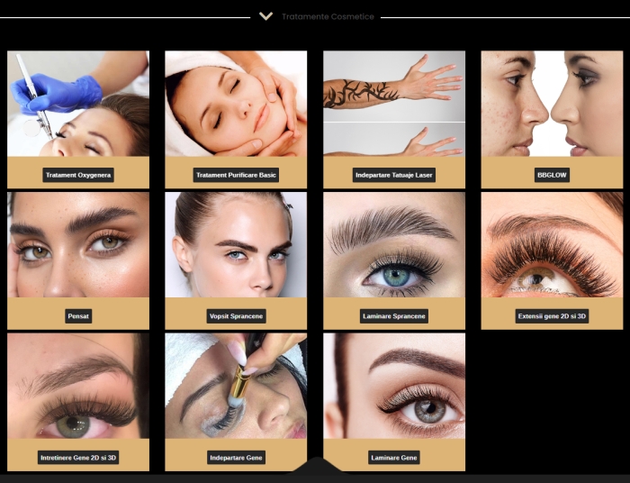 – tratamente cosmetice: tratament oxygenera, tratament purificare basic, îndepărtare tatuaje laser, bbglow, pensat, vopsit sprâncene, laminare sprâncene, extensii gene 2D și 3D, întreținere gene 2D și 3D, îndepărtare gene, laminare gene.