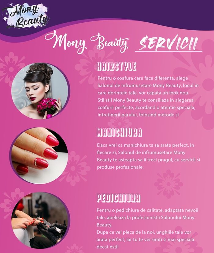 MONY BEAUTY BOUTIQUE, salon de înfrumusețare pune la dispoziția clienților modele de manichiură profesională pentru toate gusturile, pedichiură și hairstyle oferite într-un cadru vesel și primitor.
