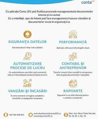 CONTA EZ SOLUTIONS S.R.L – prin intermediul aplicației Conta101, societatea sprijină întreprinderile mici pentru a debloca creșterea economică, prin folosirea aplicației poți administra finanțele de la distanță, primești notificări de la contabilul tău direct în aplicație și trimiți documente instant către acesta.